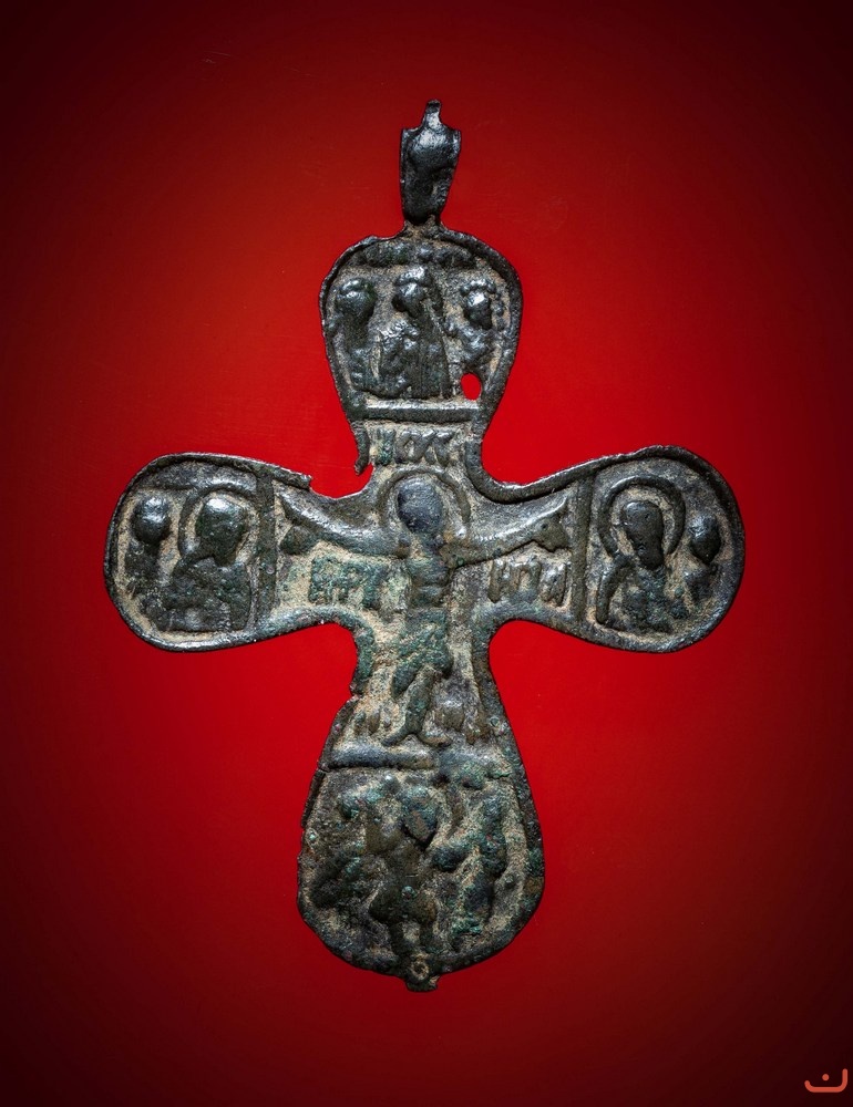 Description: Crucifixion with upcoming saints and expanding blades. Trinity at the top