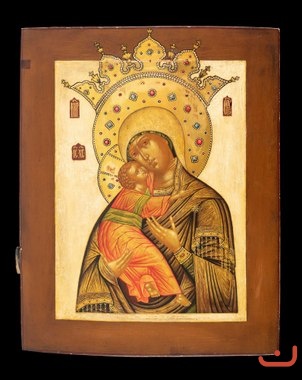 The icon is abundantly covered with solid gold. The crown is made with the gold leaf with the imitation of precious stones. The clothes are exquisitely painted with the melted gold. Baby's hair and inscriptions are also made with gold.