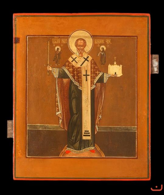 St. Nicholas the Miracle-worker of Mozhaisk is a particular iconography of the saint. In the icons of this type the saint is not submitted with the holy book and plateau, but with the sword and temple in the divorced hands. At the top on the sides there is Mother of God and Jesus Christ with the Gospel and the omofor.