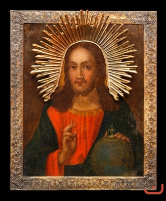 Description: Christ's face with big beautiful eyes smoothly written in bright colors in the "academic" manner. Christ sends blessing by his right hand. In his left hand - so-called orb. It is the attribute the royal power. Lord-iconpainting in the so-called academic style . Luxury jewelry framing (setting).