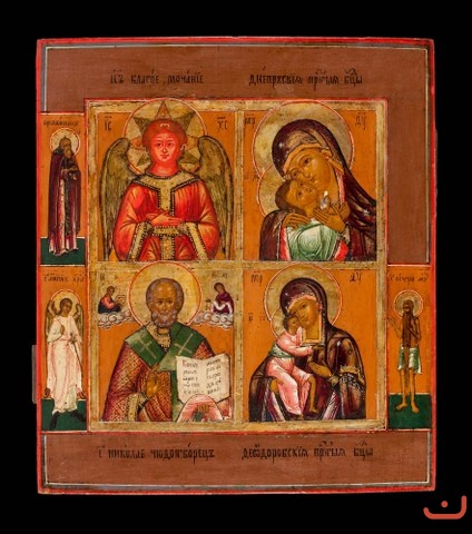 "Four-part icon "Jesus Christ - Good silent", "Mother of God of the Dnieper", "Mother of God of St. Theodore", " Saint Nicholas""