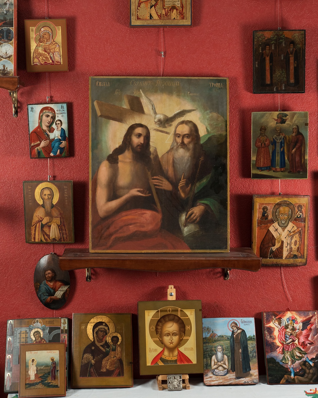 Description: The wonderful icon of the New Testament Trinity, where the God Savaoph and the Jesus Christ and the Holy Spirit in the shape of a dove holding a baby in diapers in it's paws. This is the the rarest detail.