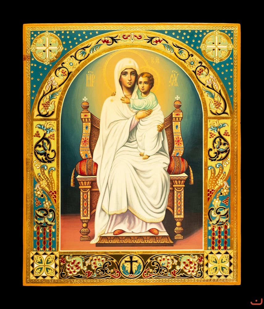 Description: This icon has the highest level of Neo-Byzantine style. The beautiful faces of the Mother of God and the Child, the luxurious Throne and the multi-colored background of the icon are complemented by richly decorated arched fields. The complex ornament of the fields is made with gold leaf and multi-color cold enamel.
