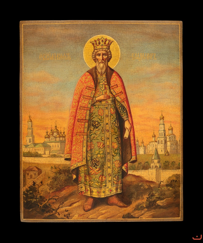 Description: Saint Vladimir is depicted in full growth against the background of the fortress wall of Kyiv and Orthodox churches. The crown, decorated with precious stones and richly decorated clothes, emphasizes the royal significance of the saint - the Baptist of Rus'.