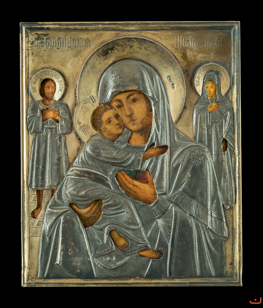 "The Mother of God of Vladimir in a silver kyot (oklad)."