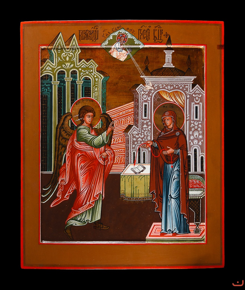 The icon painting of this icon of the Annunciation is distinguished by this theological accuracy, impeccable adherence to canons, a rich but harmonious balanced palette of colors. No Western influences or deviations from the ancient canons. Byzantine tradition. We can confidently say that this school was guided by the most ancient samples. For example, this plot returns us to the earliest iconography of this plot. Since the Frolovsk school arose on the basis of the “Pomeranian” (White Sea coast) school, from where the first Old Believers came with their icons and was later rethought by the master and having acquired a unique look, nevertheless some of the nuances of icon painting and the color palette have a recognizable Pomeranian origin.