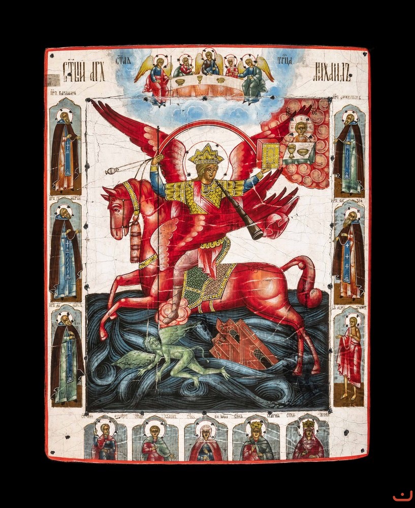 The plot is described in more details in the catalogue "Icons from private assemblies. Russian icon painting of the 14th - early 20th centuries / Catalogue of the exhibition in Central Museum of Ancient Russian Culture and Art of Rublev". "Iconography of the Archangel Michael as the Horseman of the Apocalypse (Ch. 8, 10) with numerous allusions to the texts of the Revelation of John the Theologian appears only in the second half of the 17th century in connection with the church reform, which gave rise in society to a keen sense of the “near end” of the world and experiences of the end times. The appearance of interpretations on the book Apocalypse contributed to the creation of new iconographic plots, including "Archangel Michael - Governor of the Formidable Forces", where "prince of Apocalypse" appears at the moment of his duel with the devil - a decisive eschatological battle against evil. In the Old Believer environment, this plot acquired an incredibly wide distribution, especially in the 18th and in the first half of the 19th century." (the author of the description is I.A. Shalina). *