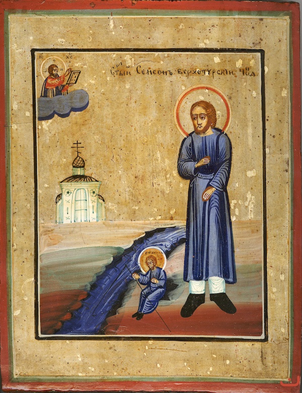 Description: Saint Simeon of Verkhoturie was a nobleman who was concealing it and chose a life of hardships and poverty. He traveled a lot, but usually lived at the cemetery near the city of Verkhoturie on Ural. Simeon lived an ascetic life, full of hardships and ordeals, and was making clothes for the poor people. In his spare time he loved to catch fish, and that served for creation of his iconography.