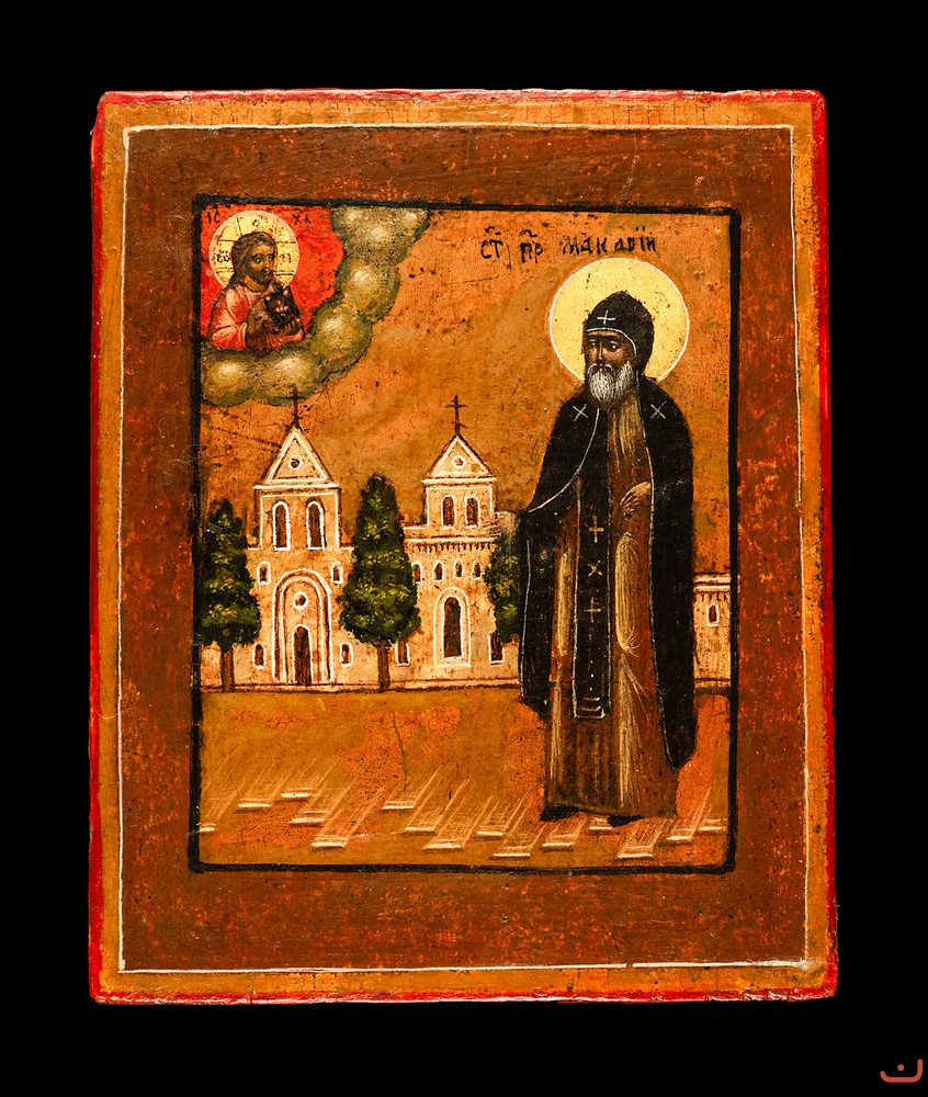 Description: The saint is depicted against the background of the Unzhenskoo (?) monastery.