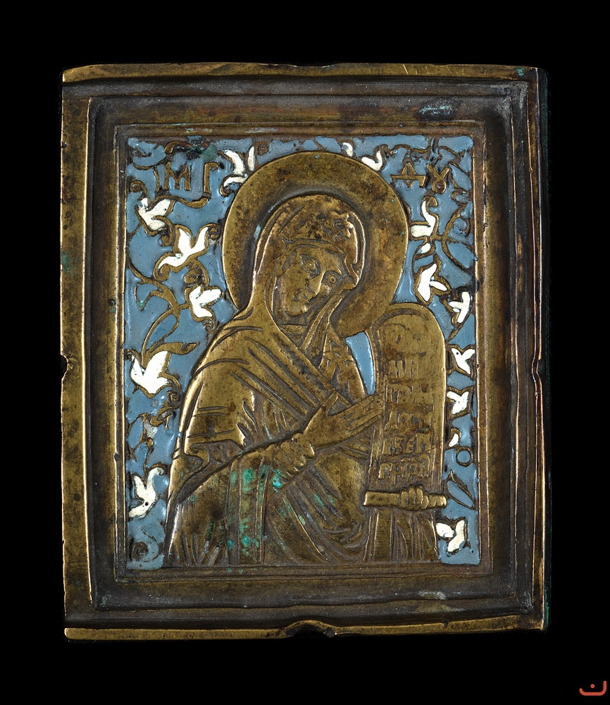 Медь, литье, перегородчатая эмаль двух цветов (белая и голубая), золочение.