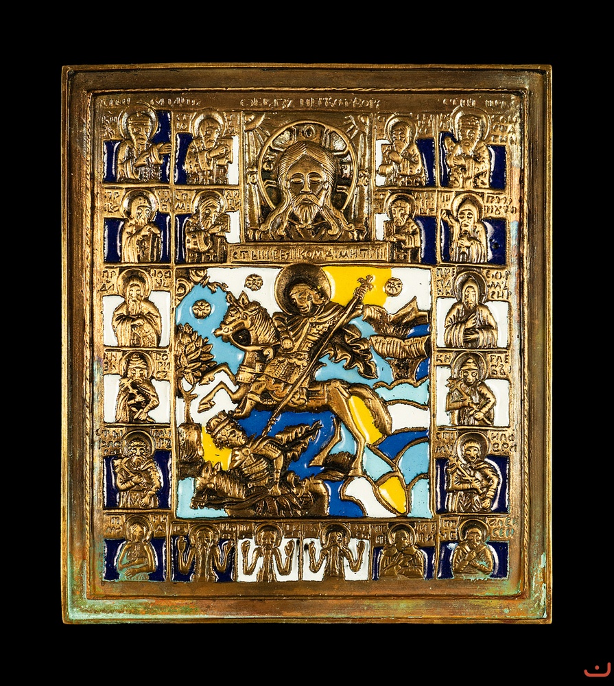 Description: In the middle on the item we can see a scene of the Miracle of Demetrius of Solunski: Saint warrior Demetrius, sitting on a mighty horse, strikes the wicked Tsar Koluyan with a spear. On the top of the item there is the image of the Savior and along the perimeter of the item there are icons of selected saints.