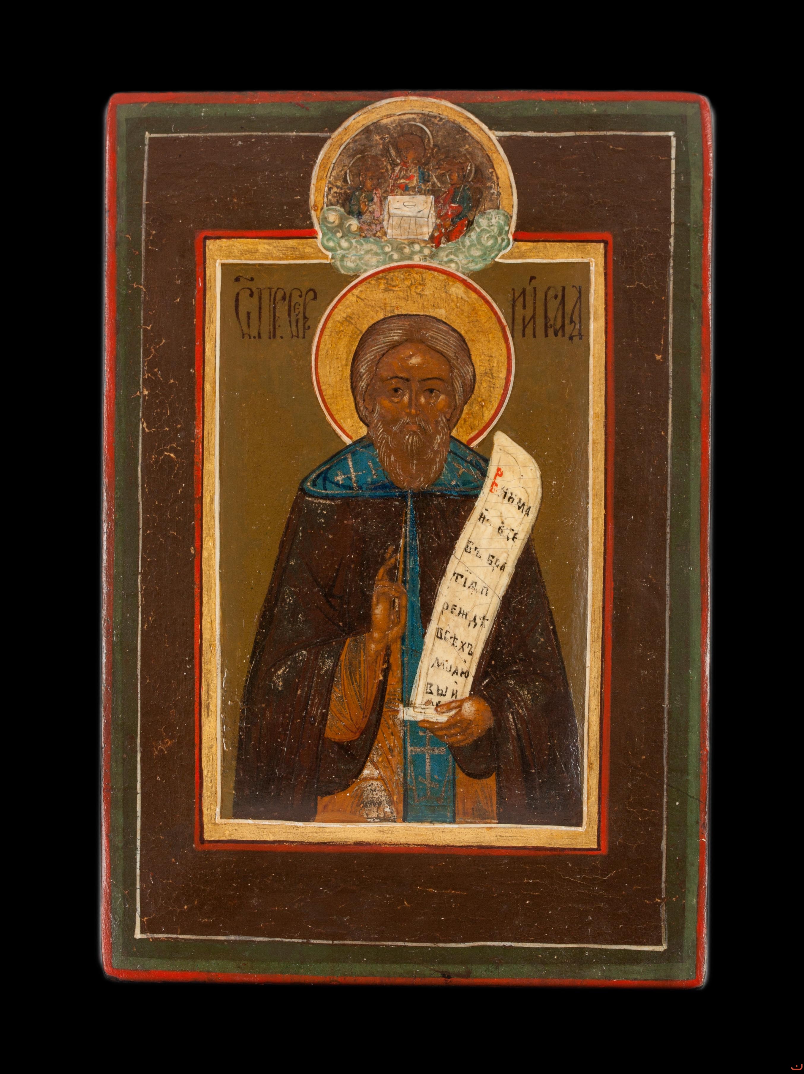 Description: Very thorough and elegant art of the high class. Halo of the Saint and the inner frame, made with gold leaf and polishing. At the top of the composition over the head of St. Sergius - Image of the Trinity - in honour of which Sergius built this monastery. This is an indication that the icon was established in the monastery.