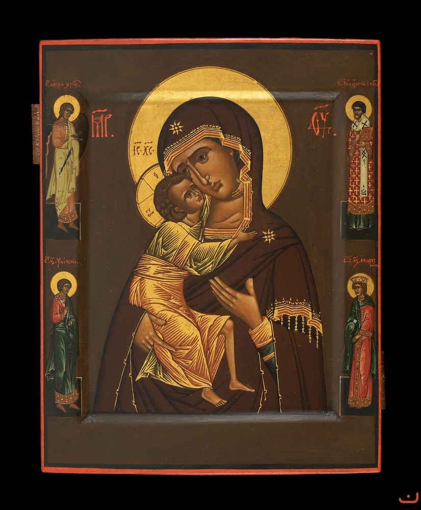 Description: Personal painting in a classic Byzantine manner in a highly professional manner level. Probably this is a custom-made icon that was made as a copy from the ancient miraculous Greek icon. We can see it from the style of the monument and the 4 forthcoming saints on its fields: Saint John Chrysostom, Saint Catherine, Saint Mary of Egypt and Saint Julian.