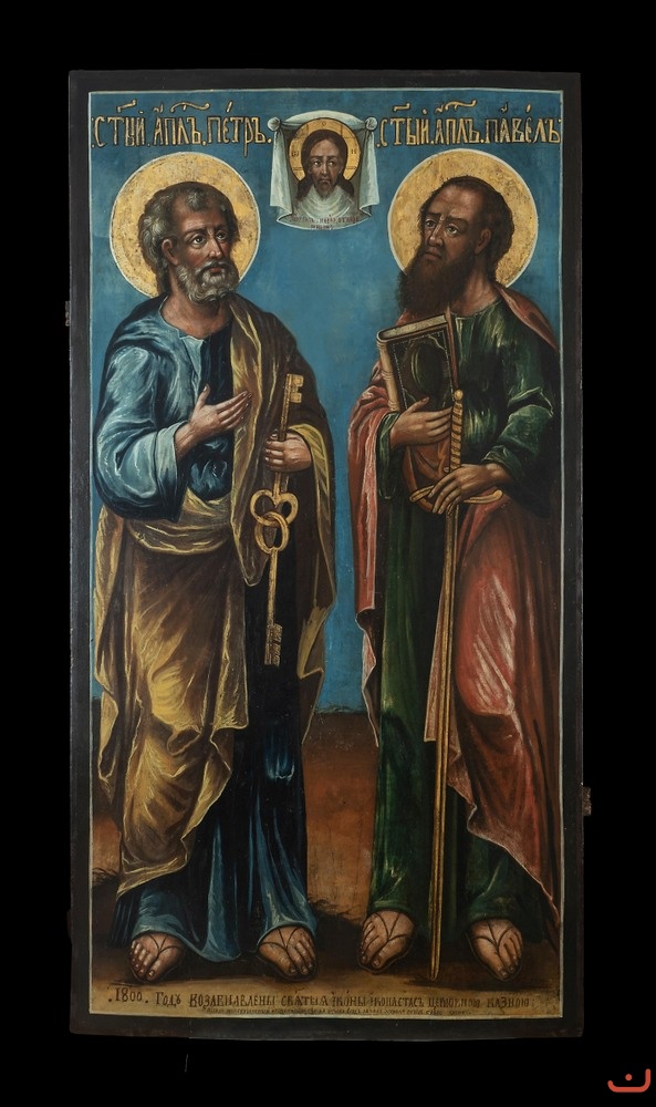 Description: This icon has the highest level of painting. Bright polychrome palette, flowing draperies of clothes, golden halos. The liveliness of faces and hands is achieved thanks to the “ochrenie” technique - a multi-layer application of layers of tempera from a dark base to transparent final layers. Apostle Peter holds in his hands the Keys to Paradise, Apostle Paul holds the Sword and the Gospel. The composition is completed by the image of the Savior at the top of the icon. This icon was very revered and was restored in 1800, as evidenced by the inscription at the bottom of the icon: “1800. This saint icon was restored at the expense of the church treasury of the city of Pechera by icon painters Egor Rakov and Paul Lagin.” This inscription - is a rare case, which tell us about the enormous significance of this icon.