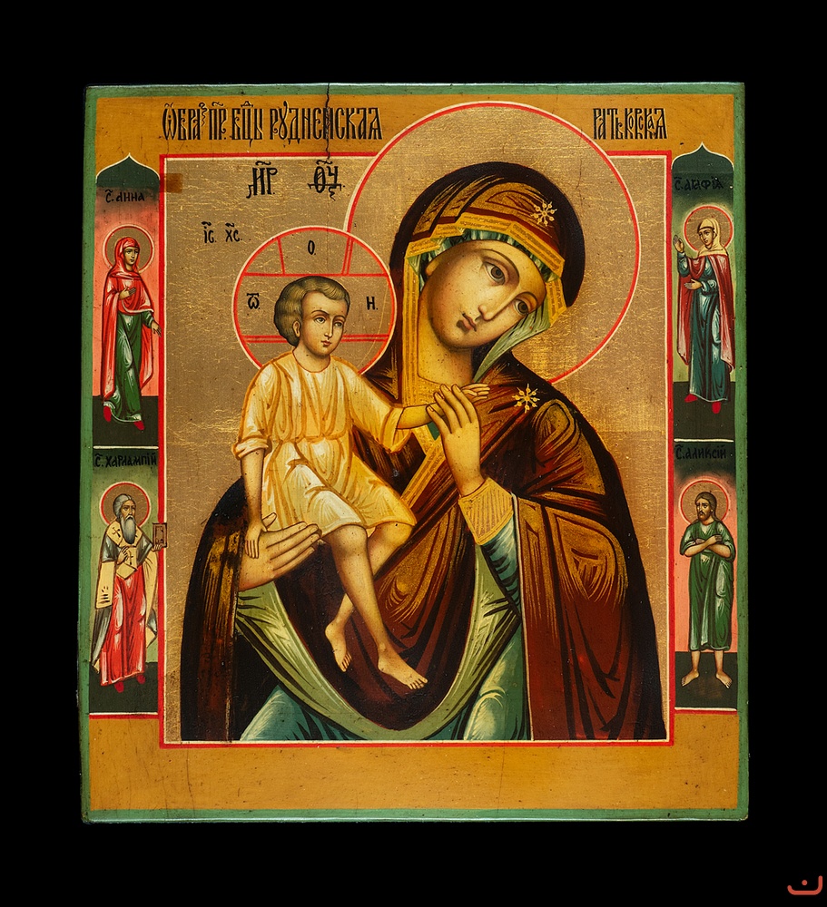 Description: The miraculous Rudnya Icon of the Mother of God was revealed in 1687 in the town of Rudnya, Mogilev diocese. In 1689 it was moved to the Kiev-Pechersk Convent. The subject is rare, especially revered in Ukraine. This icon was painted by the order, as evidenced by the figures of saints in the fields. Good state of preservation.