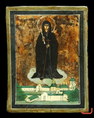 Description: This image of the Mother of God is a very rare and unusual icon. It depicts the Mother of God in the dress of the abbess , standing in the sky above the monastery . The image of the Mother of God as the prioress is very rare in the iconography. It is known only one such type iconography : " The Abbess Mountain Athos ," which depicts the Mother of God standing on the Holy Mountain.