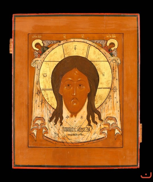 Description: This icon is masterfully executed in ancient canonical and so-called "school" style. Christ's face is modeled with several layers of transparent melt and accentuated with fine, white brushstrokes. Halos of the Christ and angels are made of gold leaf.