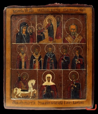 Description: The icon is a bright example of the folk iconography. In this one icon we can see the whole family iconostasis for the concrete family. A very significant part of the saints - they are favorite patrons and helpers for Russian peasants. It was obligatory to have the icon of saints in the house.