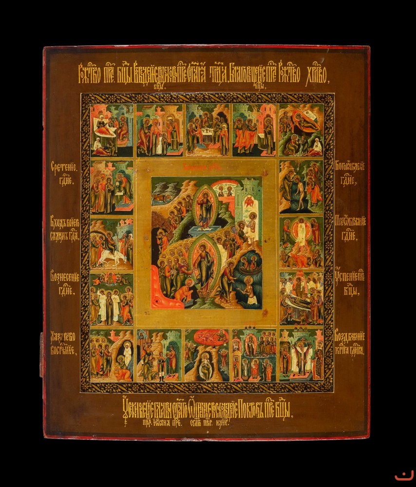 Description: This icon is an masterpiece of the Syzran icon-painting school. An unique monument in perfect state of preservation. The sanctuary impresses with the highest level of painting, even in small miniature nuances, despite its large royal size. Faces painting is executed in many layers. Virtuoso paleography with gold leaf.