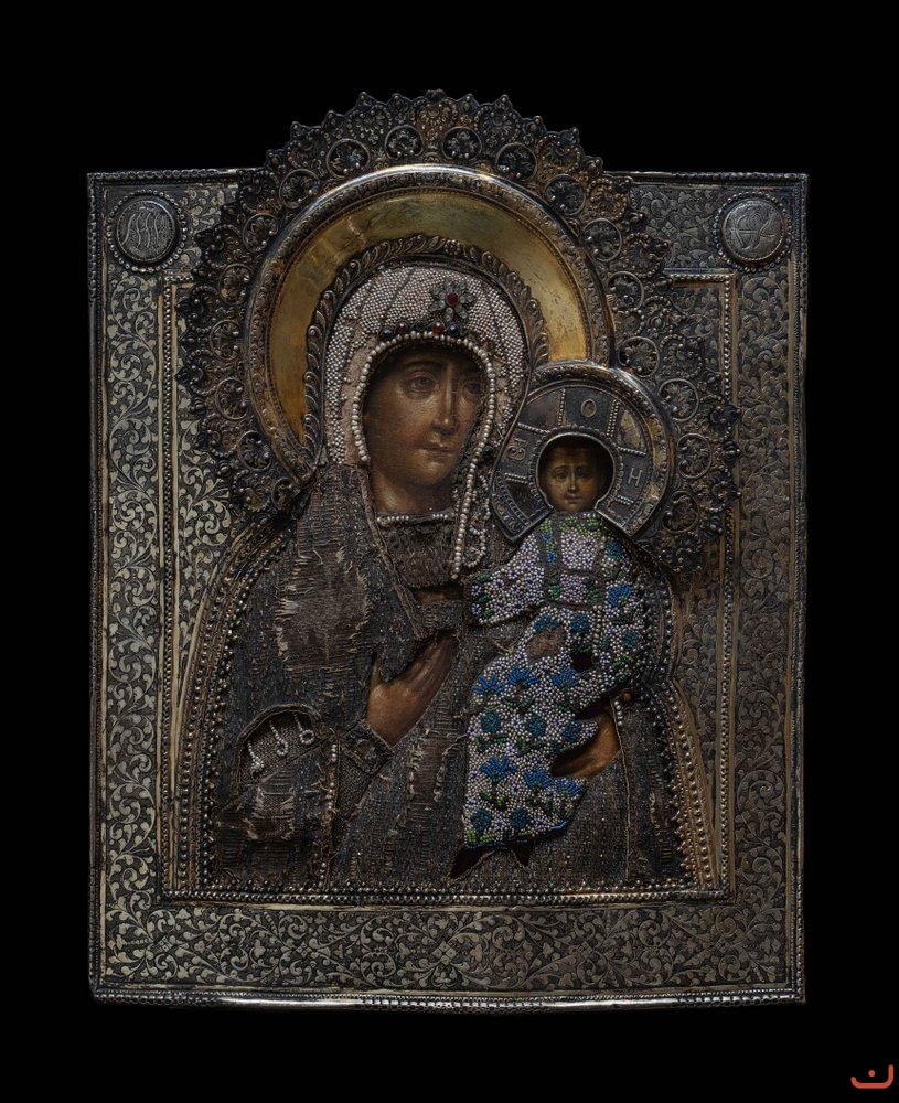 Technique & Material: Oklad: silver with embossing and engraving, beads, pearls, a crown with gold plated on mercury.