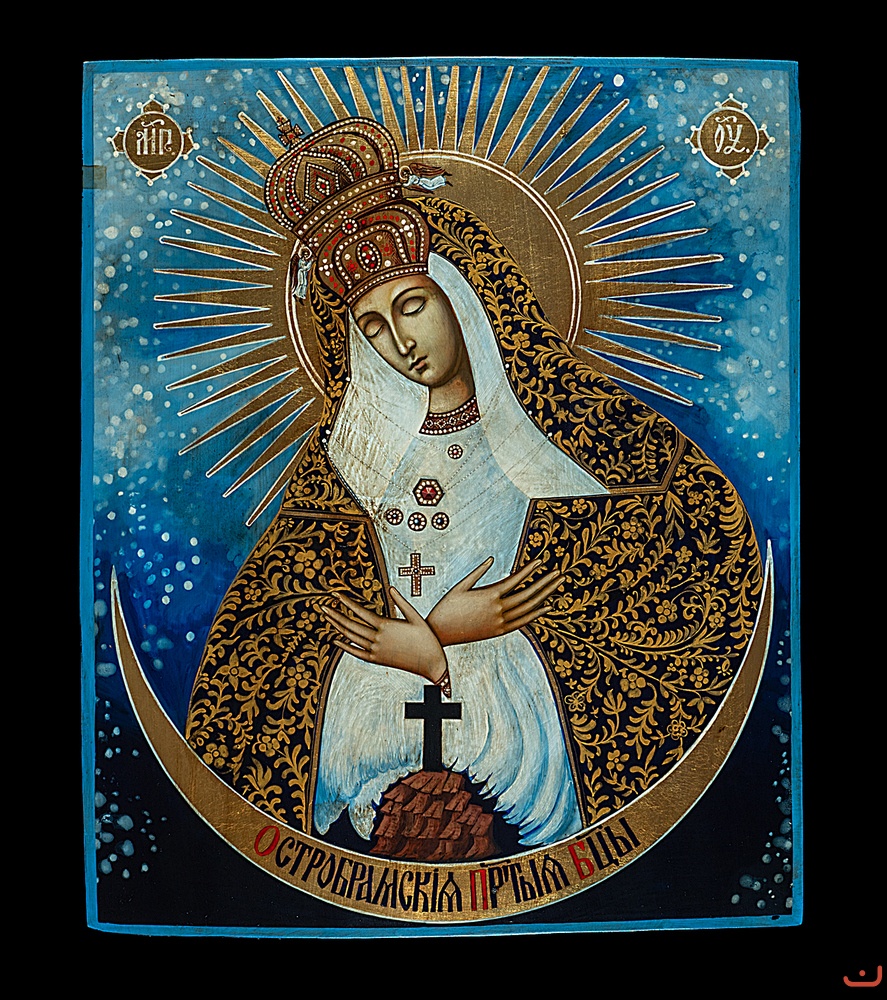 Mother of God is surrounded by sharp rays of radiance with stars. The blue palette emphasizes the tenderness of the image of the Mother of God. It is known that to the miraculous image of the Mother of God Ostrobramskaya, goes back to the iconography of the Mother of God Tenderness, before which the Monk Seraphim of Sarov prayed.