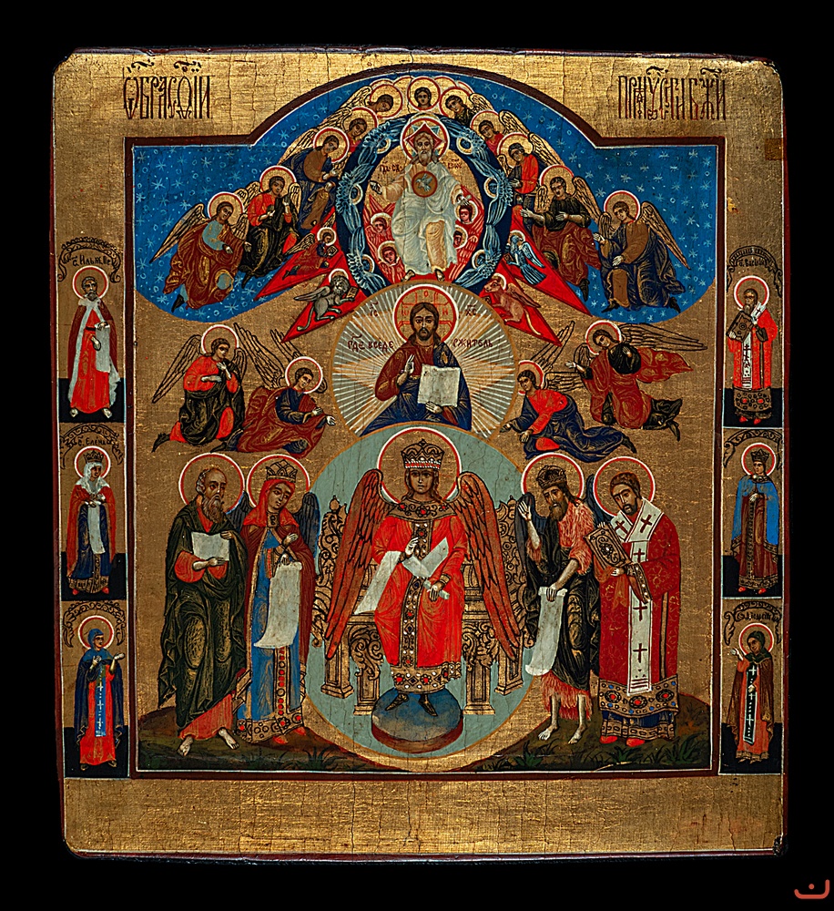 Saint Sophia is depicted in the royal crown, in bishop's red robes, seated on a gilded throne. Selected Saints are depicted to the left and right of the Throne. Above Saint Sophia there are two hypostases of God: God the Son and God the Father. Angels, Cherubim and Seraphim crown the complex composition of the icon.