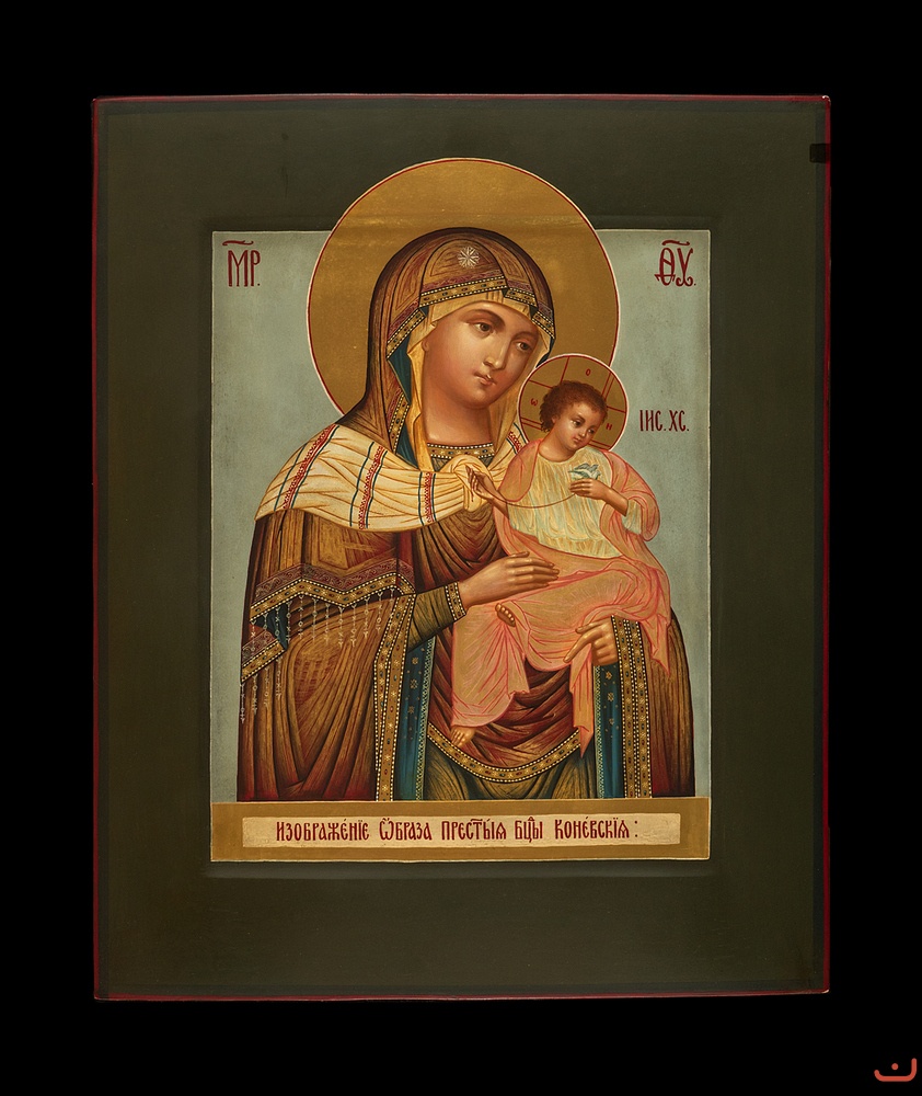 This icon has rare iconographic version of the Mother of God, where the Child holds in his left hand not a scroll, but a dove. The plot was brought to Russia from Athos in 1393 by the Rev. Arseny Konevsky. The Icon of the Mother of God Konevskaya is deeply revered both in Russia and in Finland.